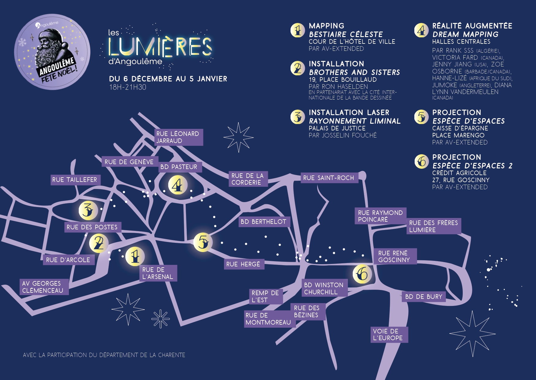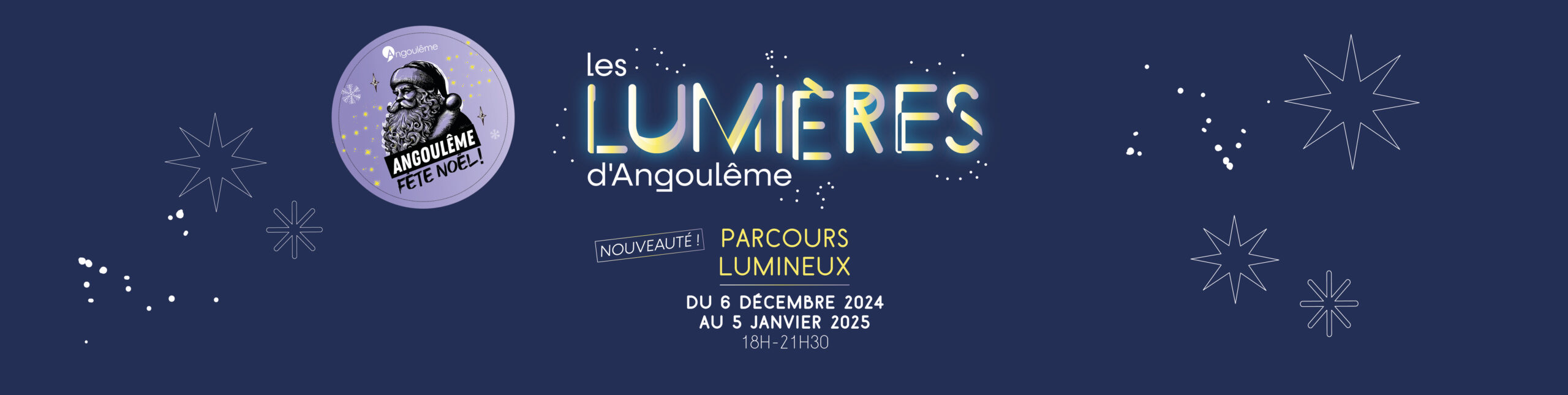 - đŁ Marches guidĂ©es « DĂ©couverte des LumiĂšres dâAngoulĂȘme » : Les 23, 27 et 30 dĂ©cembre, participez Ă des visites immersives de 17h Ă 19h, au dĂ©part du parking du LycĂ©e Guez de Balzac.
